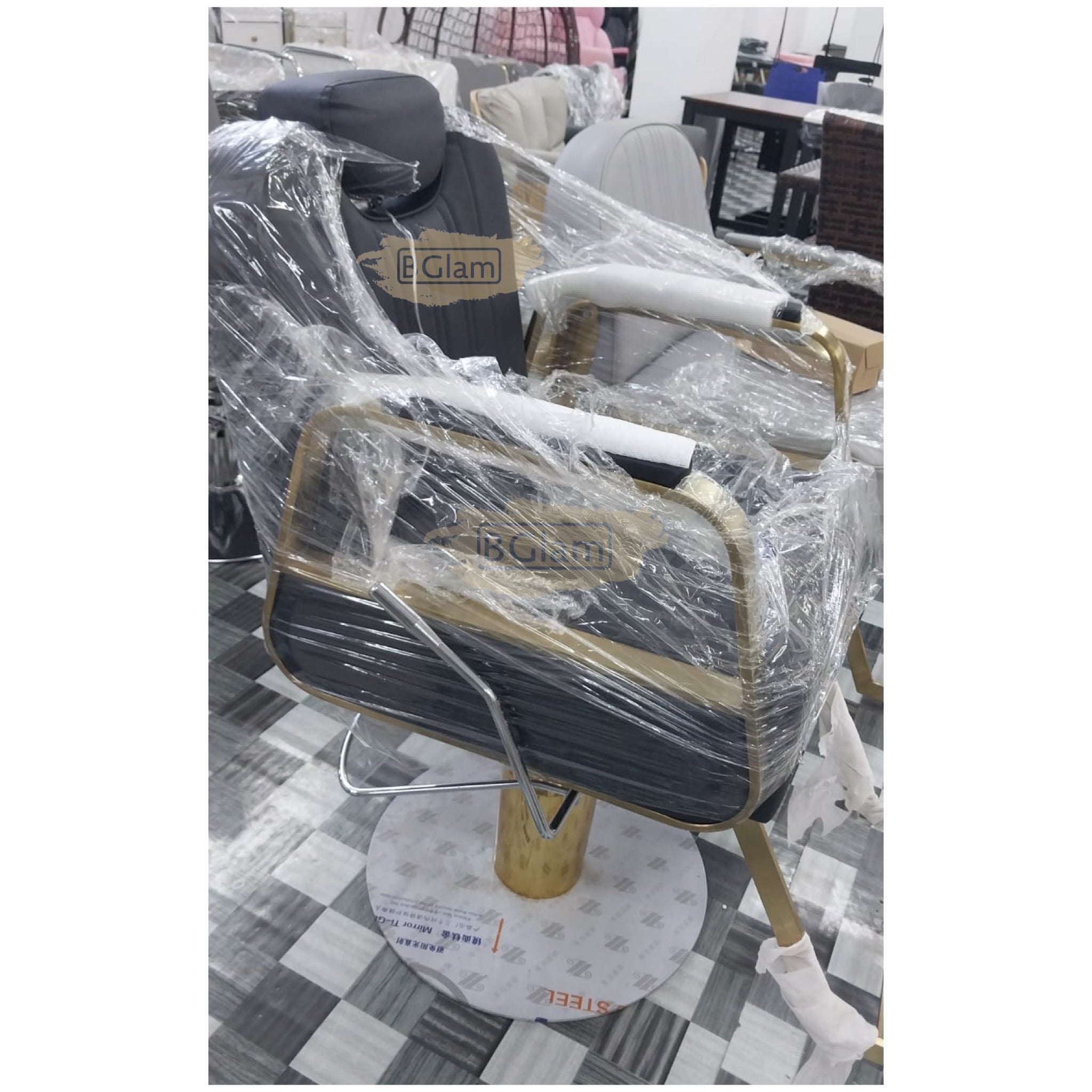 Modern Salon Styling Chair with Hydraulic Lift and Titanium Stripes Handle | Round Gold Disc Plate | Black