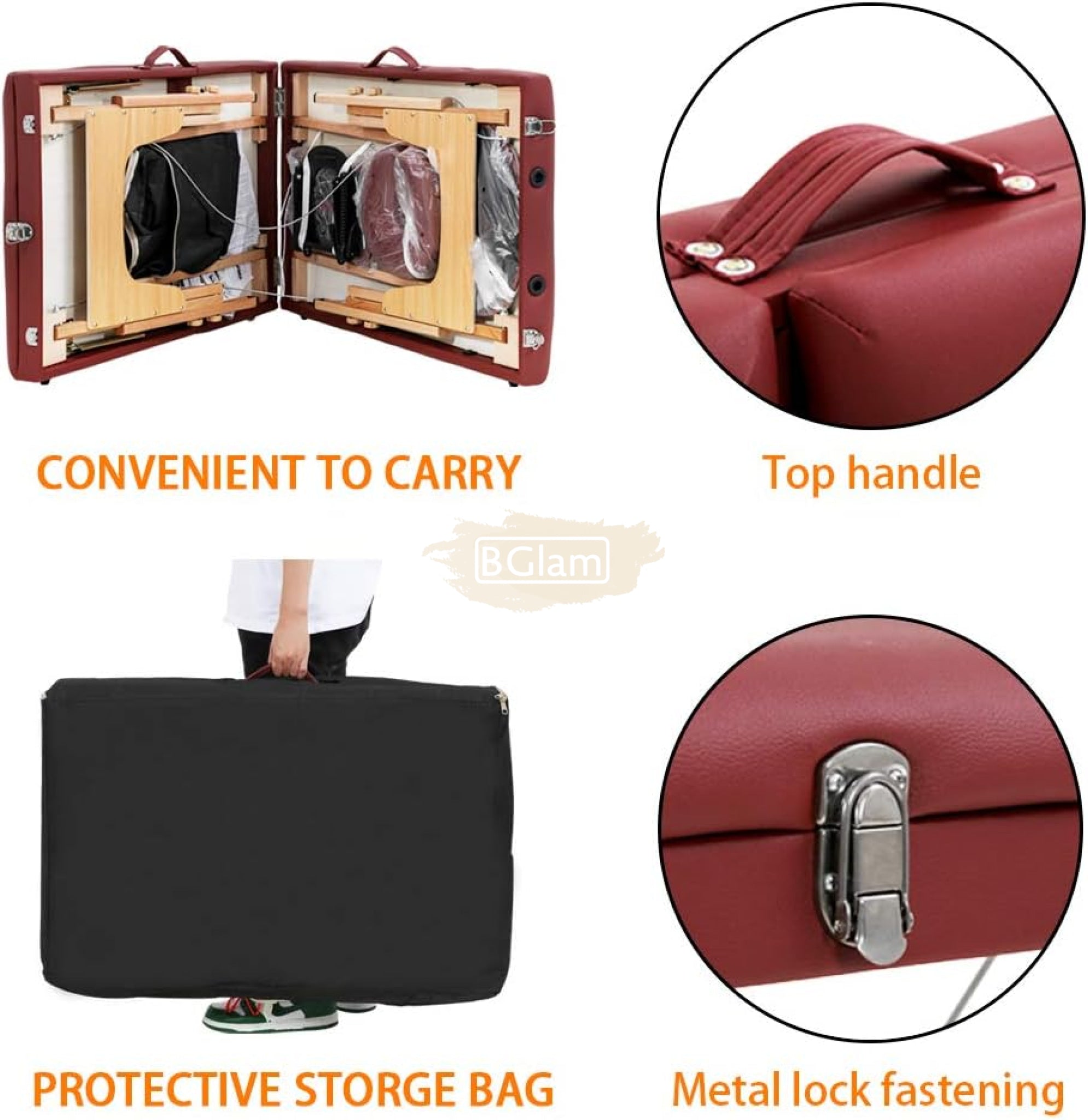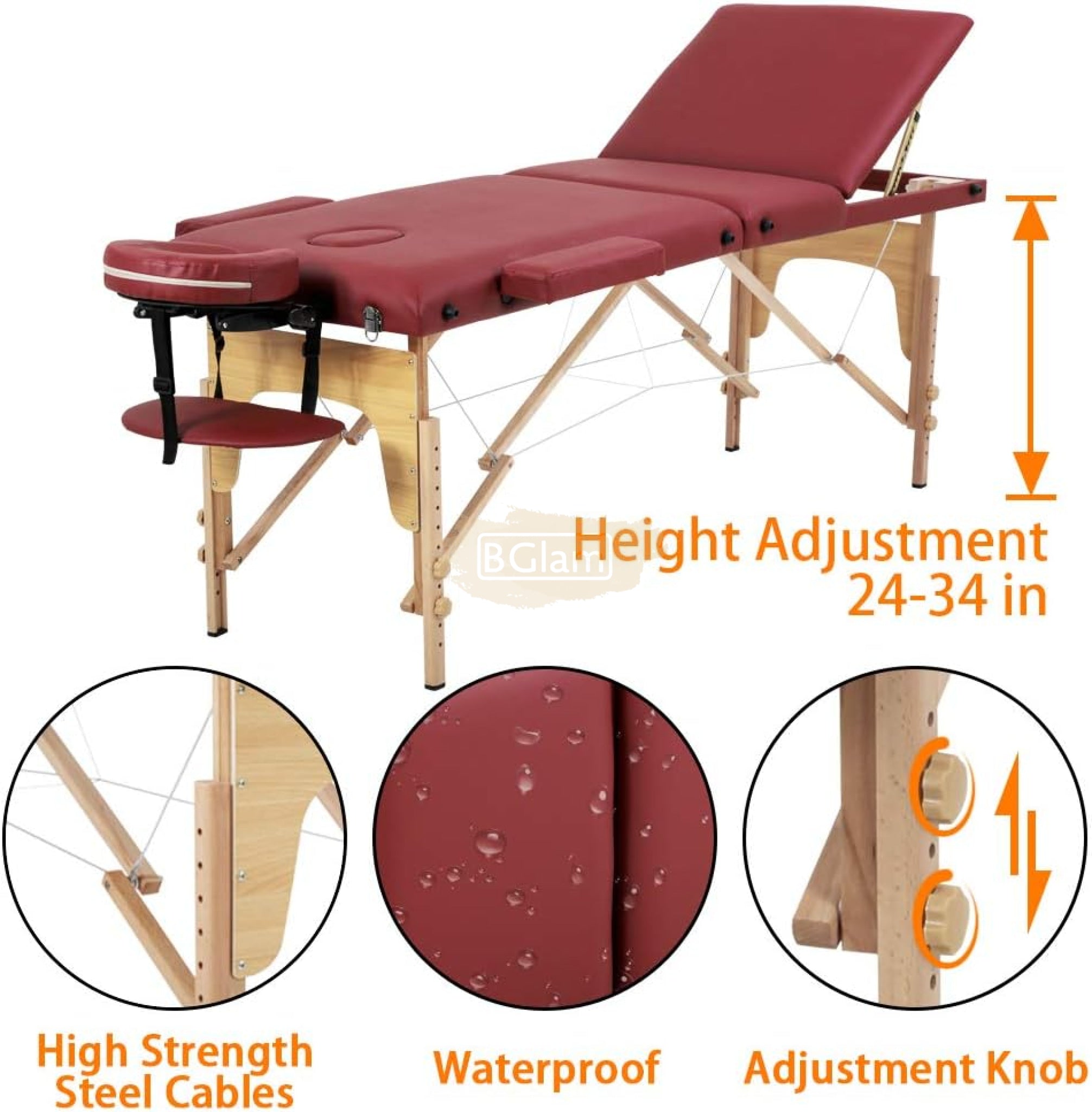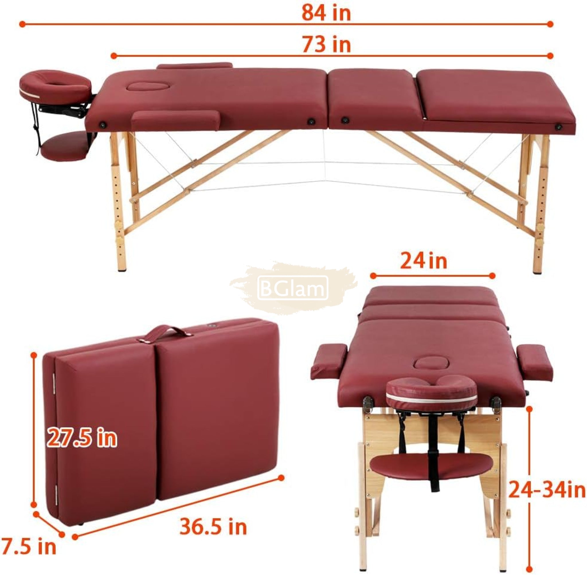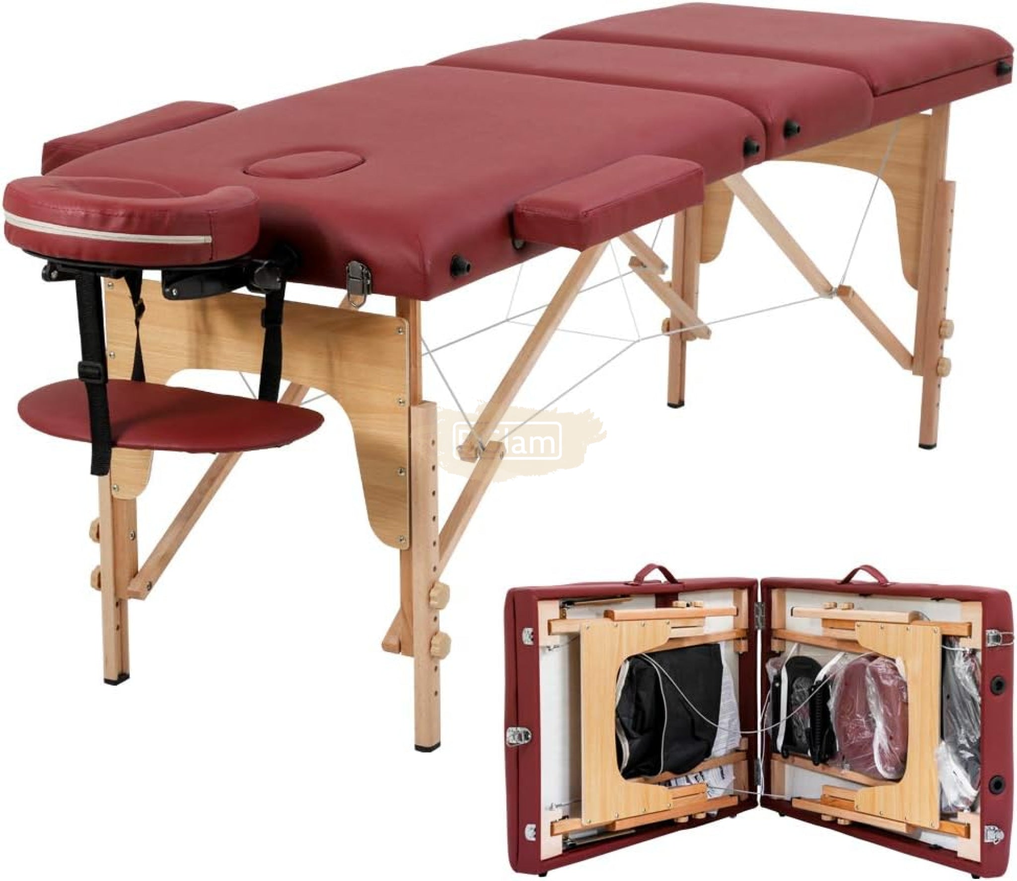 Portable Massage Spa Bed 180*60cm | Wood | 3 Zones | Burgundy