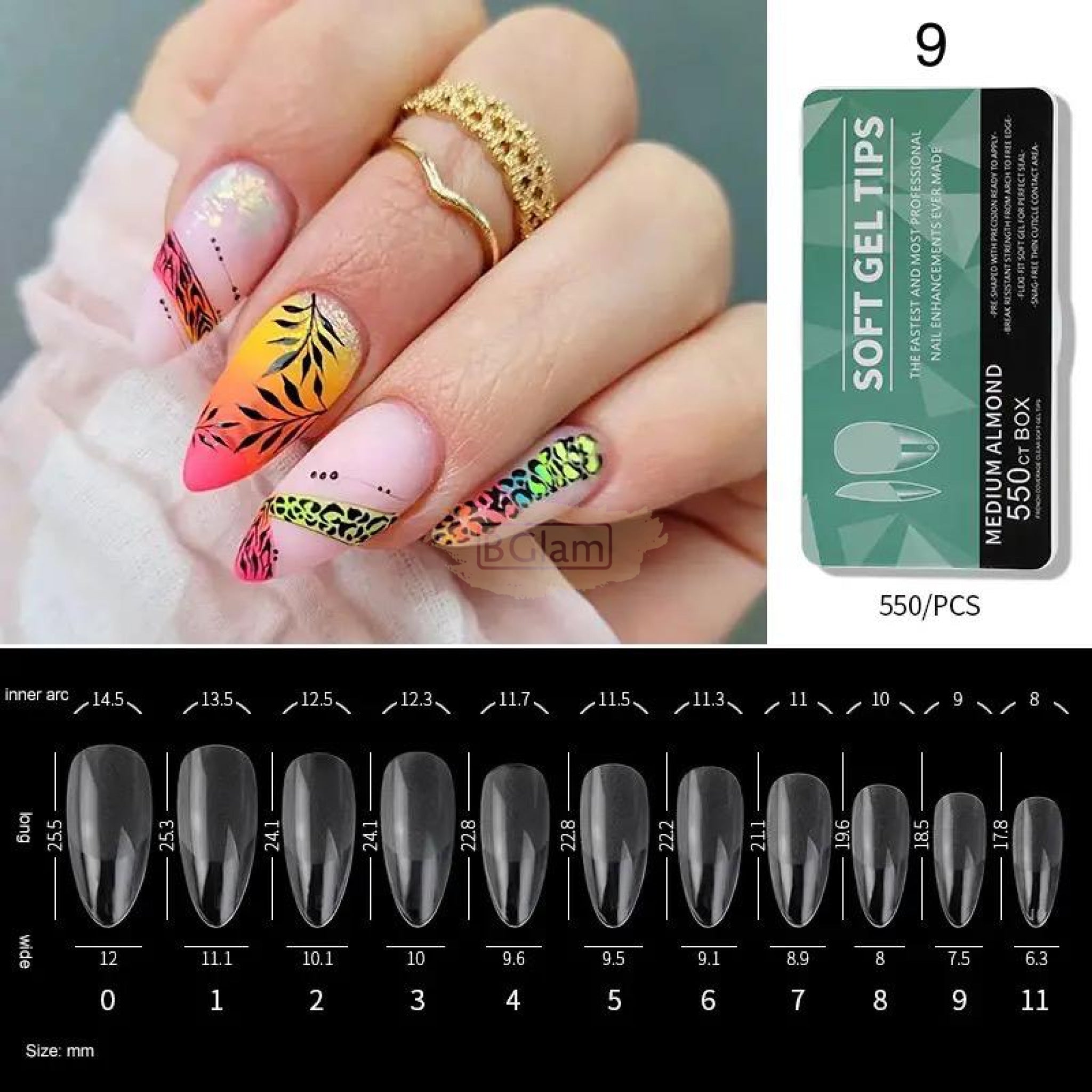 550pcs Soft Gel Tips Medium Almond | Full Cover | H105-9 Green Box