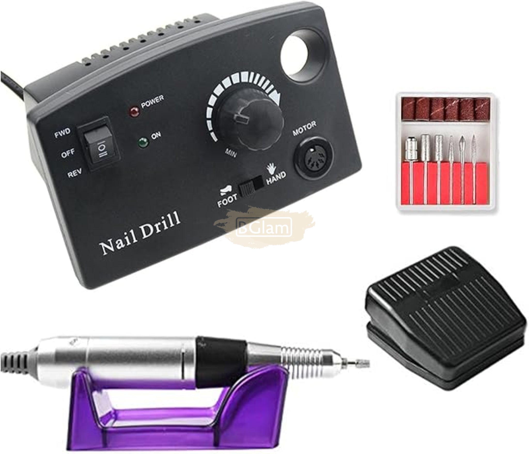 Includes full drill bit set for shaping, filing, buffing, and removing extensions